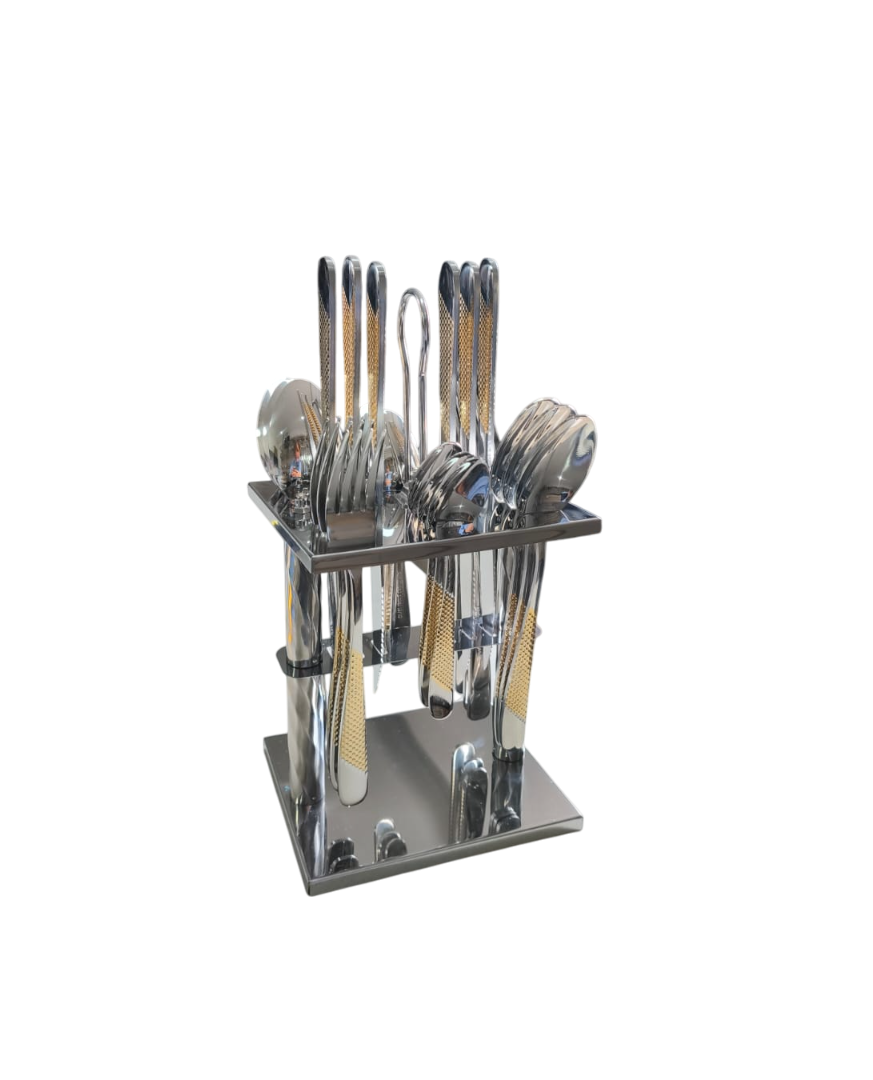 Su base en acero permite una presentación organizada y moderna, facilitando el almacenamiento y aportando un estilo sofisticado a tu cocina o comedor. Diseñados para brindar comodidad y equilibrio en cada uso, estos cubiertos combinan practicidad con un diseño atemporal.